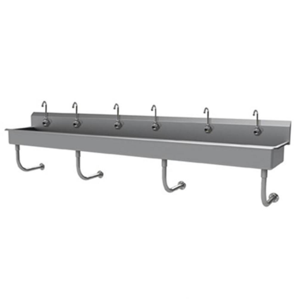 Multiwash Hand Sink, splash mount faucet provision, wall mounted, with (6) electronic faucets, 120''W x 19-1/2''D x 25-1/2''H (overall), 16'' front-to-back x 5'' deep (bowl size), 8-1/2''H backsplash, punched