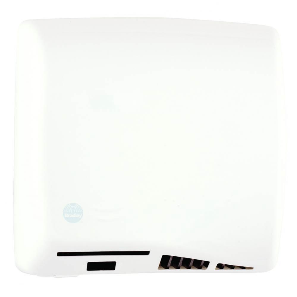 Bradley Aerix Hand Dryer. 1/16in. thick one-piece steel cover, white epoxy finish. Cover fixed to the base plate with two vandal-proof lock screws and lock with special key wrench. Universal-type with high-speed, universal brush, fully adjustable potentiom
