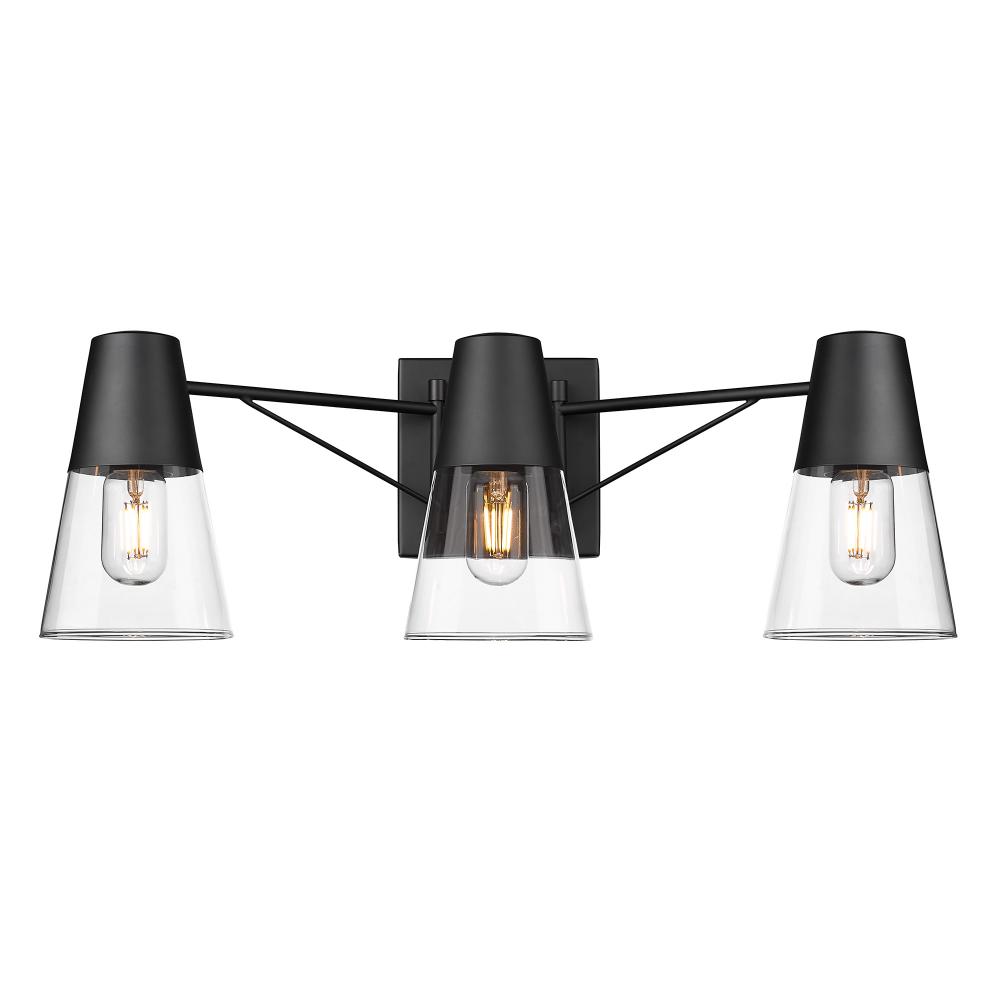 Bring modern industrial elegance into your home with the Wry Lighting Ryker 3-light Vanity in Matte Black. Featuring a glass shade and a matte black frame, it creates a welcoming atmosphere. The clear glass shade offers brilliant, unobstructed light, complemented by its polished high-gloss finish. This versatile shade shines brightly, making it perfect for various styles, from minimalist to contemporary. With the epitome of clean, modern style, the matte black finish has a smooth surface that absorbs light to deliver a sophisticated look. It's suitable for covered spaces like bathrooms and protected outdoor areas, ensuring safety and style. Overall Dimensions: 25.38"W x 8.5"H x 8.63"D, Requires 3 E26 Medium base bulbs (not included) with a maximum wattage of 60 per bulb, providing both functionality and elegance to your lighting scheme. Enhance your bathroom’s ambiance with this sleek and elevated fixture from Wry Lighting, where quality meets contemporary design.