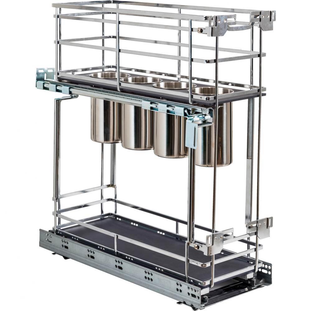 Improve your counter sightlines by conveniently storing kitchen utensils in this stylish 8'' pullout in Polished Chrome finish. STORAGE with STYLE''s curved flat wire design details flow across all organizers to create a cohesive collection