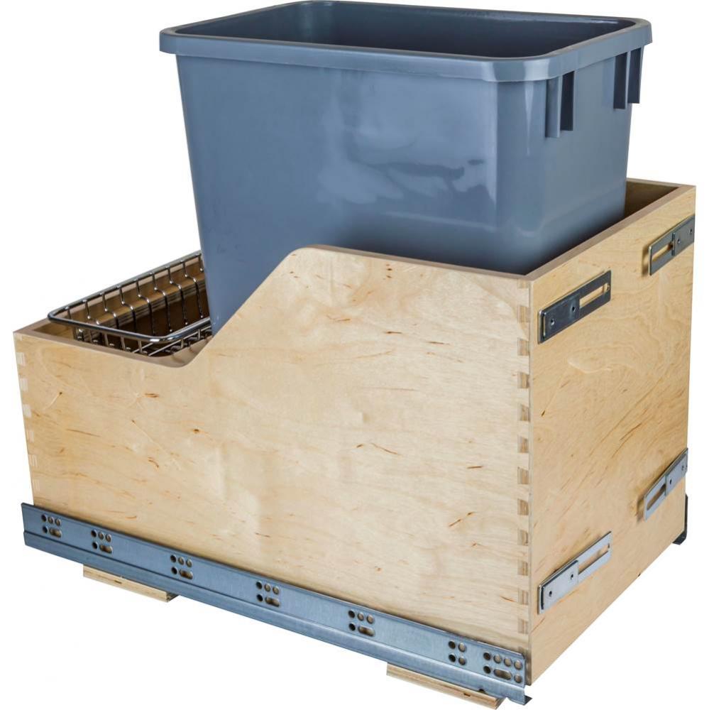 Neatly tuck away trash cans with this beautiful solid wood drawer box Soft-close trashcan pullout. Designed for cabinets with a 12'' opening width. Ships fully preassembled with 35 qt grey plastic trash bin. Simply take out of box and screw to bott