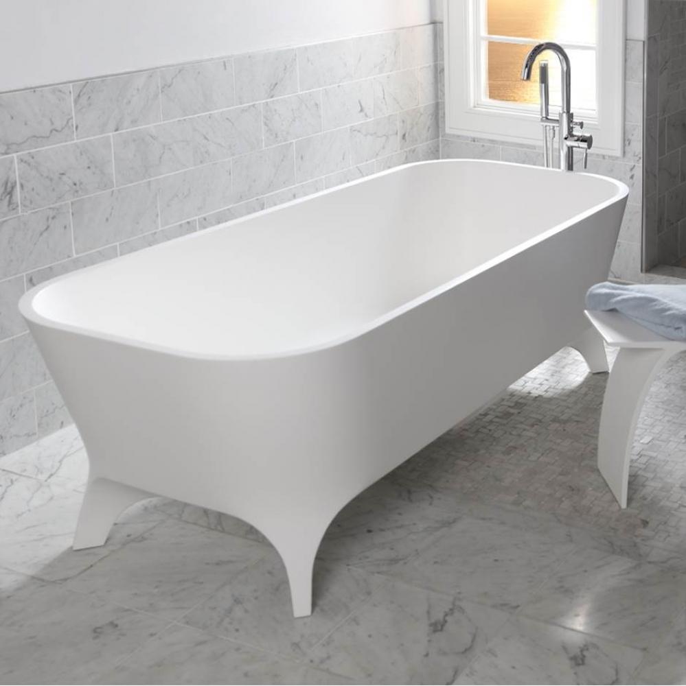 Free-standing soaking bathtub made of white solid surface with an overflow and a decorative solid surface drain; net weight 408 lbs, water capacity 91 gal. W: 70 7/8'', D: 31 1/2'', H: 23 5/8''.