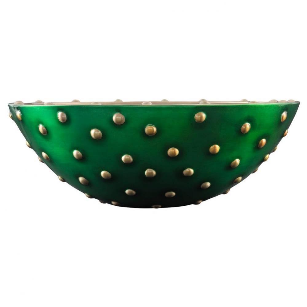 The beautiful double-walled Altamira vessel looks like it grew out of a lush velvety moss oasis. The hand lacquered green finish on the exterior feels intense, yet crisp and fresh. And, the Antique Satin Gold interior with half pearls, accents the green pe