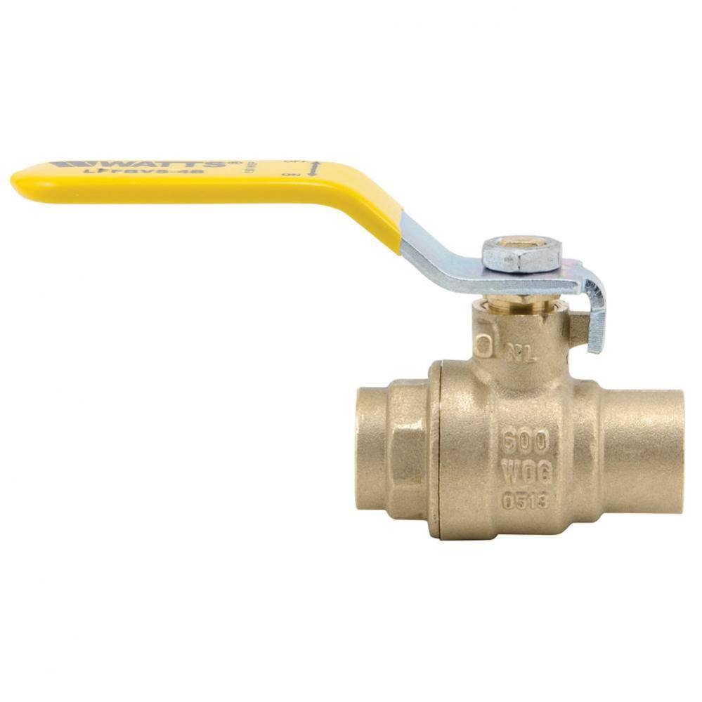 This 1/2 inch 2-piece full port lead free ball valve is used in commercial and industrial applications for a full range of liquids and gases. It features a lead free brass body with solder end connections, bottom-loaded blowout-proof stem, virgin PTFE seat, thrust washer, and adjustable stem packing seal, chrome plated lead free brass ball, lead free brass adapter and steel handle.