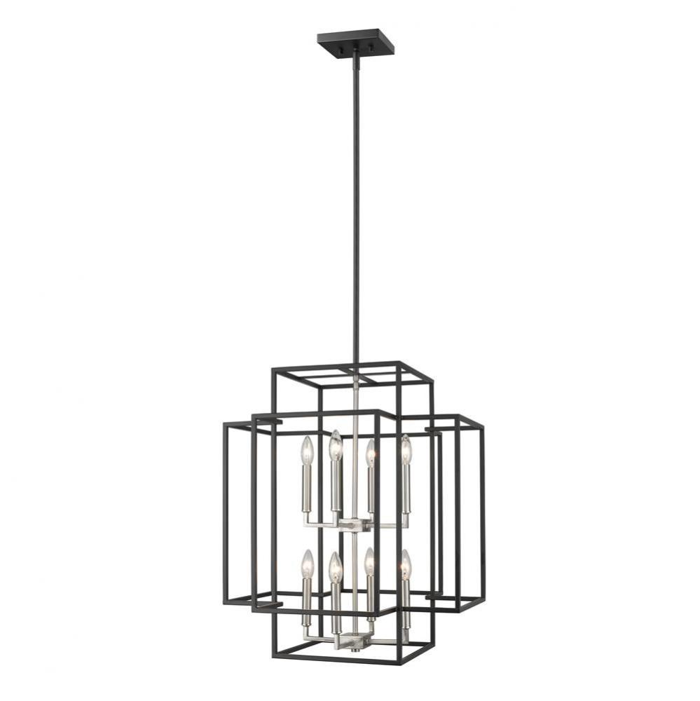 Dimensionality and open-concept design bring an enticing flavor to this black and brushed nickel steel eight-light pendant. With a commanding-yet-versatile presence, it delivers radiant illumination in a motif that blends crisp modern style with a soft rom