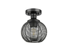 Bring industrial elegance into your home with the Golden Lighting Calypso 1-light Semi-Flush Mount. Featuring a metal shade and a Matte Black frame, it creates a welcoming atmosphere. The metal shade emphasizes a full wire mesh cage design, presenting a chic and authentic industrial vibe. The matte black finish provides a smooth surface that effortlessly complements a variety of decors. Perfect for entryways, bedrooms, and living areas with mid-height ceilings, this fixture is damp location rated—ideal for rooms with occasional moisture. Requires 1 E26 Medium base bulb (not included), max wattage of 60. Dimensions: Overall Dimensions: 7.63"W x 8.88"H x 7.63"D. Experience sophisticated lighting that melds style and practicality in your home.